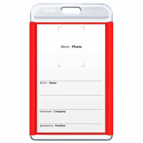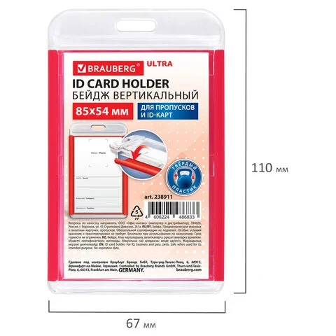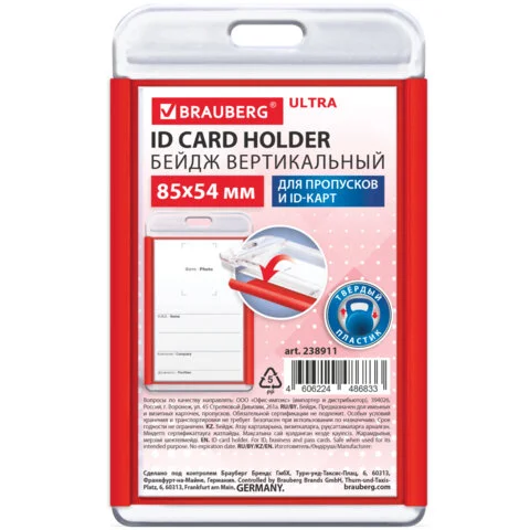 Бейдж вертикальный для пропуска и ID-карт, 85х54 мм, красный, BRAUBERG ULTRA, 238911
