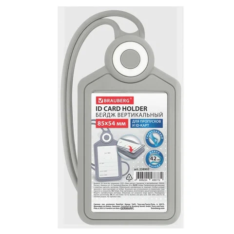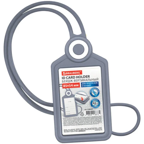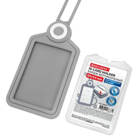 Бейдж вертикальный для пропуска и ID-карт, СИЛИКОНОВЫЙ, 85х54 мм, шнурок 42 см, серый, BRAUBERG, 238