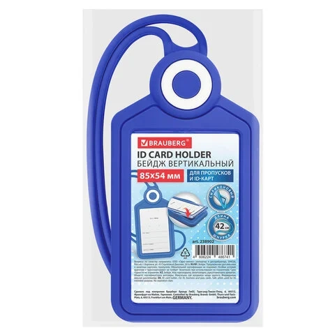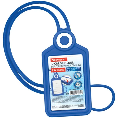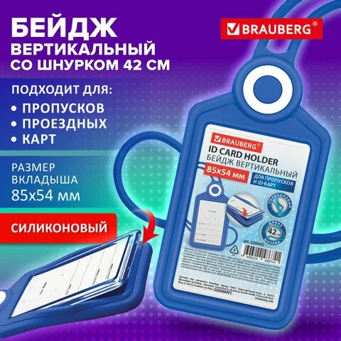 Бейдж вертикальный для пропуска и ID-карт, СИЛИКОНОВЫЙ, 85х54 мм, шнурок 42 см, синий, BRAUBERG, 238