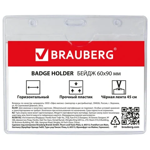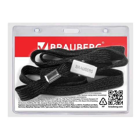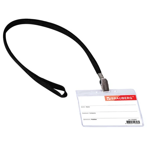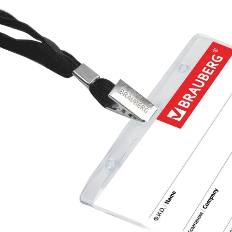 Бейдж на зажиме с тесьмой Brauberg 90х60мм, черная тесьма 45см