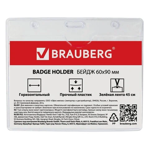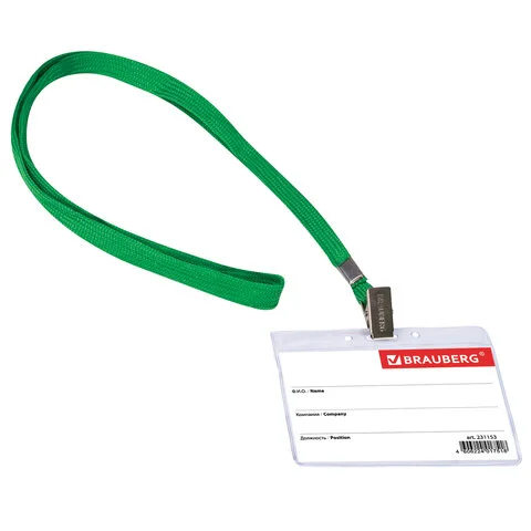 Бейдж на зажиме с тесьмой Brauberg 60х90мм, зеленая тесьма 45см