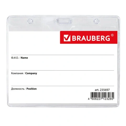 Бейдж на зажиме с тесьмой Brauberg 90х60мм, красная тесьма 45см
