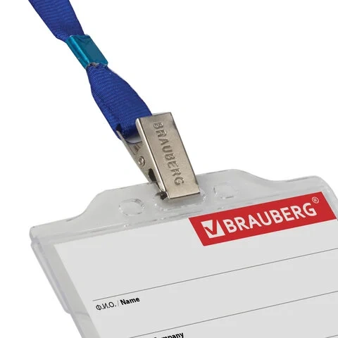 Бейдж на зажиме с тесьмой Brauberg 55х85мм, синяя тесьма 45см