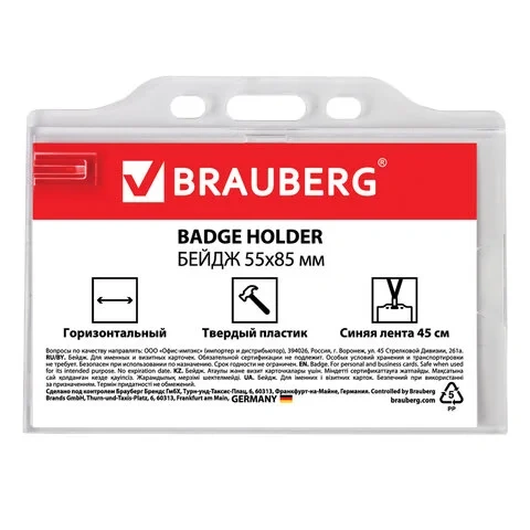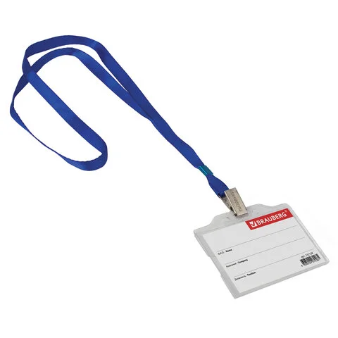 Бейдж на зажиме с тесьмой Brauberg 85х55мм, синяя тесьма 45см