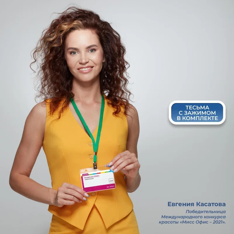 Бейдж на зажиме с тесьмой Brauberg 60х90мм, желтая тесьма 45см