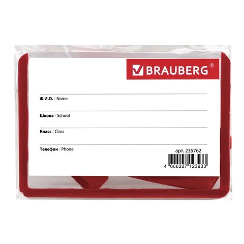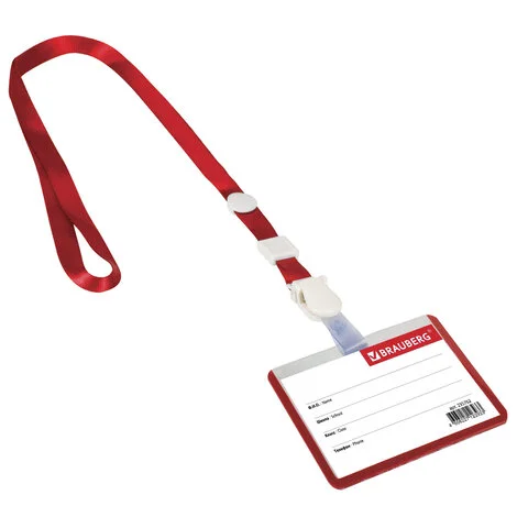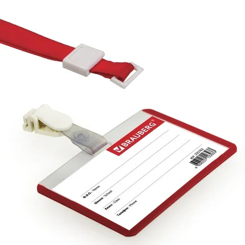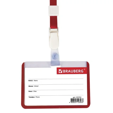Бейдж с тесьмой Brauberg для школьников 55х90мм, красная тесьма, на клип-замке с петелькой