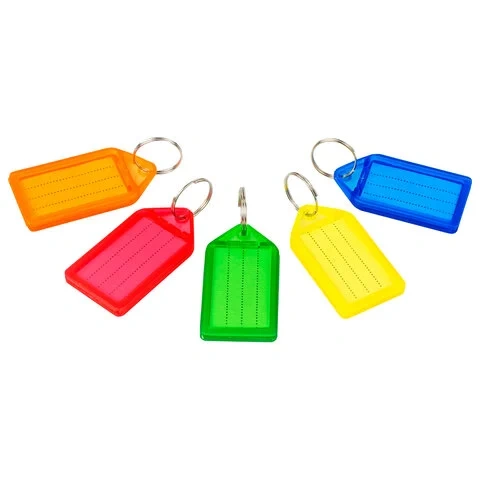 Изготовлены из эластичного пластика. Каждый брелок снабжен металлическим кольцом, белым бумажным вкладышем для маркировки, защищённым пластиковой вставкой от повреждений. Размер брелока - 55х28 мм, информационного окна - 39х22 мм. Цвет - ассорти. 1000 штук в упаковке.