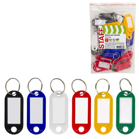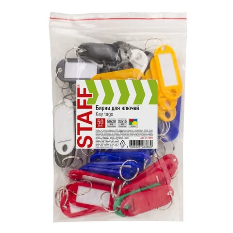 Бирки для ключей КОМПЛЕКТ 50 ШТ., длина 50 мм, инфо-окно 30х15 мм, АССОРТИ, STAFF, 23, 89
