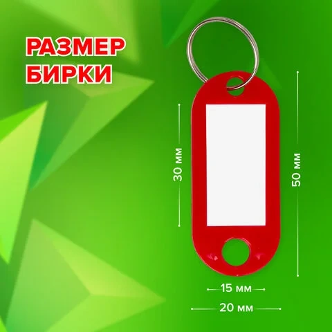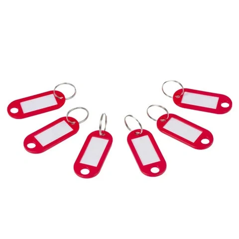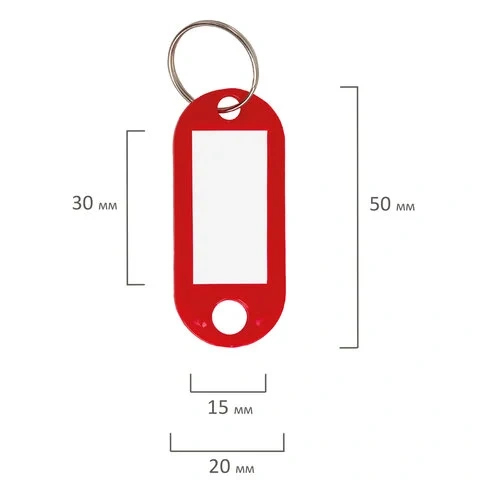 Изготовлены из эластичного пластика. Каждый брелок снабжен металлическим кольцом, белым бумажным вкладышем для маркировки, защищённым пластиковой вставкой от повреждений. Размер брелока - 50х22 мм, информационного окна - 30х15 мм. Цвет - красный. 50 штук в упаковке.