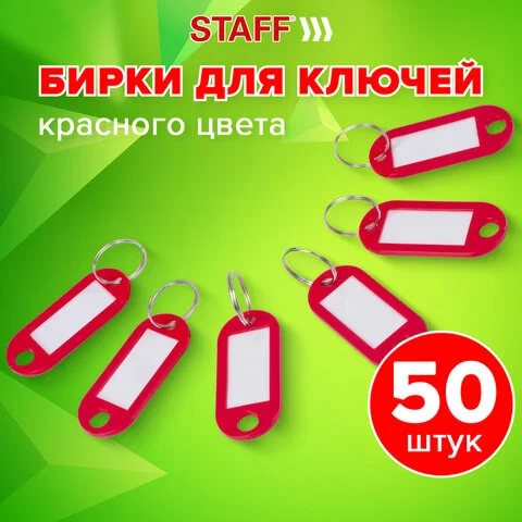 Бирки для ключей КОМПЛЕКТ 50 ШТ., длина 50 мм, инфо-окно 30х15 мм, КРАСНЫЕ, STAFF, 23, 89