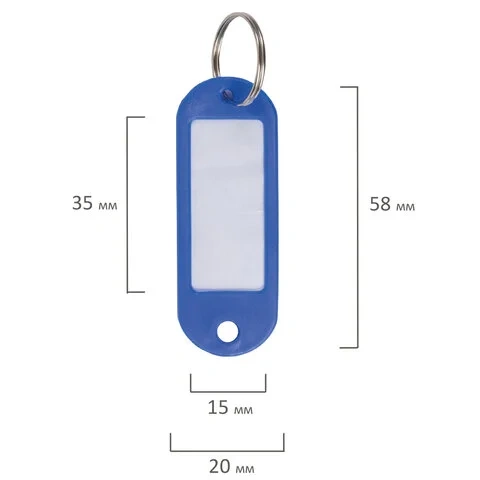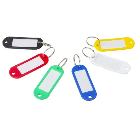 Изготовлены из эластичного пластика. Каждый брелок снабжен металлическим кольцом, белым бумажным вкладышем для маркировки, защищённым пластиковой вставкой от повреждений. Размер брелока - 60х24 мм, информационного окна - 35х15 мм. Цвет - ассорти. 12 штук в упаковке.