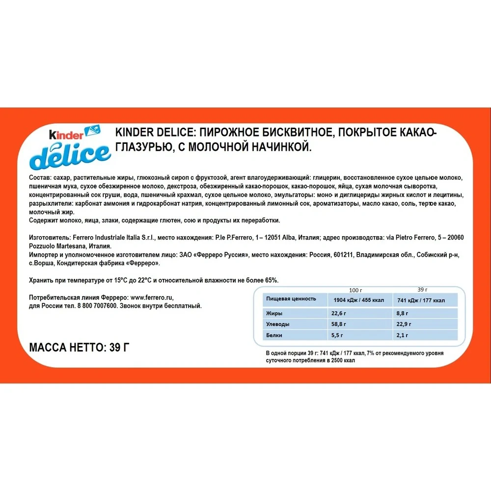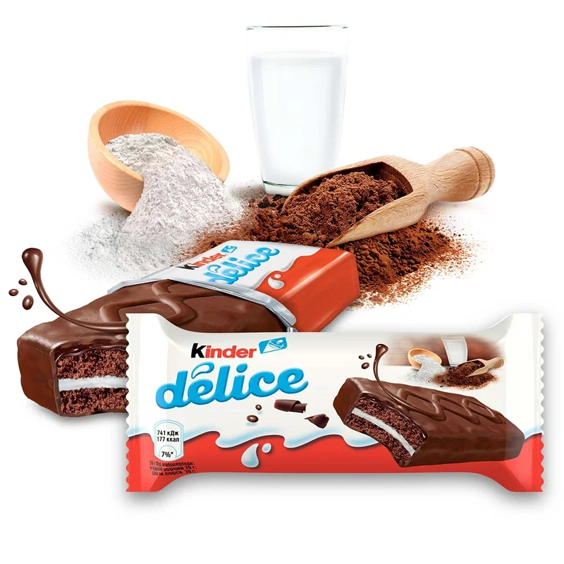 Пирожное бисквитное Kinder Delice (Киндер Делис), покрытое какао глазурью, с молочной начинкой. Создан из простых ингредиентов: молока, пшеничной муки, какао. Kinder Delice идеально подходит для любой ситуации, когда хочется перекусить и порадовать себя! Kinder Delice: полдник на отлично.