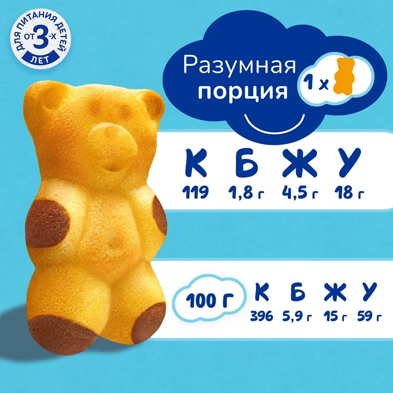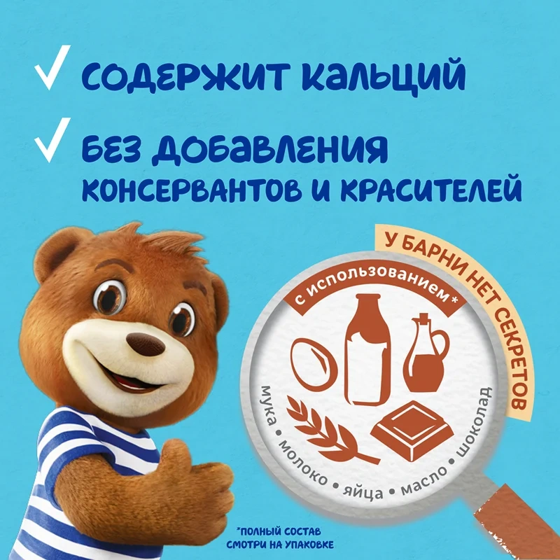 Бисквитное пирожное Барни с шоколадной начинкой - специально разработанное для детей кондитерское изделие в виде медвежонка, производится на основе натуральных ингредиентов: злаков и молочных продуктов. Обогащено кальцием, необходимым для здорового роста и развития детей, не содержит красителей и консервантов. Рекомендовано для детей дошкольного возраста от 3х лет. Медвежонок Барни - вкусный, полезный и питательный перекус, прекрасная альтернатива печенью, кексам или другой сладкой выпечке, отлично сочетается с соком, молоком, кефиром, йогуртом, чаем или какао, его удобно брать с собой в дорогу, давать ребенку в школу или на прогулку. Это отличный вариант сладкого угощения на детский праздник в детский сад, школу, на День рождения. В коробке пять пирожных в индивидуальных упаковках.