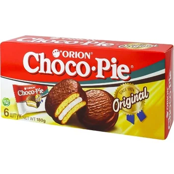 Пирожное Orion Choco-Pie Original в шоколадной глазури, 180г имеет знакомый с детства вкус нежного бисквита, покрытого шоколадом, с уникальной начинкой Marshmallow. Запатентованная технология производства и индивидуальная упаковка позволяет Orion Choco- Pie оставаться мягким и свежим надолго.