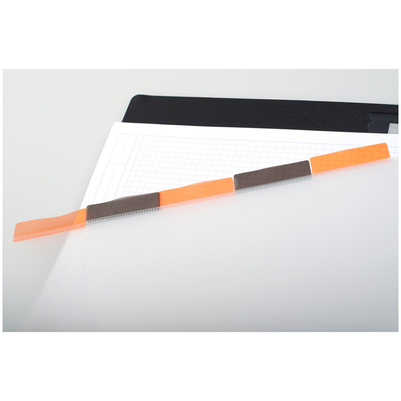 Бизнес–тетрадь Rhodia из серии Exabook станет незаменимым помощником для деловых людей, ведь в ней собрано всё необходимое для ведения и хранения записей. Обложка изделия выполнена из прочного ребристого пластика чёрного цвета с эластичной резинкой, которая надежно фиксирует тетрадь. Формат – А4+ (255*306 мм.), размер блока – 225*297мм. Вид скрепления – съёмный гребень, который дает возможность раскрывать тетрадь на 180?. Внутренний блок имеет микроперфорацию для легкого и аккуратного отрыва листа и перфорацию для подшивки листов (4 отверстия). Внутренний блок состоит из сверхтонкой гладкой бумаги Clairefontaine объёмом 80 листов плотностью 80 г/м2. Линовка – клетка с рамкой для заголовка, даты и английскими полями. Бизнес–тетрадь содержит следующие бизнес–добавки: 5 съемных перегородок, служащие разделителями и карманами для документов; съемная линейка, которую с легкостью можно перемещать в удобное место; карман для диска и карман для визиток, а также наклейки–стикеры для подписи разделителей.