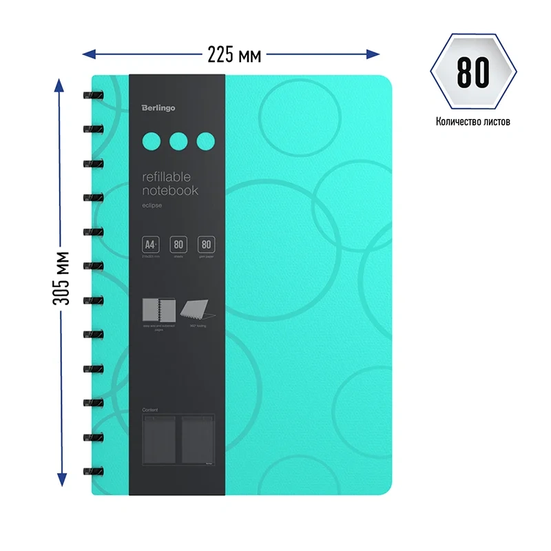 Бизнес-тетрадь Berlingo 'Eclipse' - это практичное, стильное и современное изделие для планирования и записей. Такая бизнес-тетрадь является незаменимым инструментом для деловых людей. Увеличенная толщина обложки (1500мкм). Формат А4+. Насыщенный бирюзовый цвет внешней стороны в сочетании с изящной фактурой в виде глянцевых пересекающихся окружностей. Контрастный яркий синий цвет внутренней поверхности. Материал обложки - трехслойный пластик (полифом), надежно защищает внутренний блок от влаги, замятия и загрязнения, обложка устойчива к загрязнениям. Вид скрепления – стильные имиджевые черные кольца, с возможностью раскрывать тетрадь на 360?. Возможна замена бумажного блока и быстрая и удобная выемка/вставка листов без повреждений. Бизнес-тетрадь содержит съемную брендированную линейку, которую можно использовать как закладку или разделитель и с легкостью можно перемещать в удобное место. Внутренний блок – высококачественная тонированная бумага, плотностью 80г/м2, 80 листов в клетку, рамка для заголовка, темы или даты, поля с обеих сторон блока на каждом листе, линовка на вылет. Размер бизнес-тетради 305*225мм, диаметр колец 22мм. Упаковка в термоусадочную пленку позволяет предохранить листы от замятия и загрязнения в процессе транспортировки.