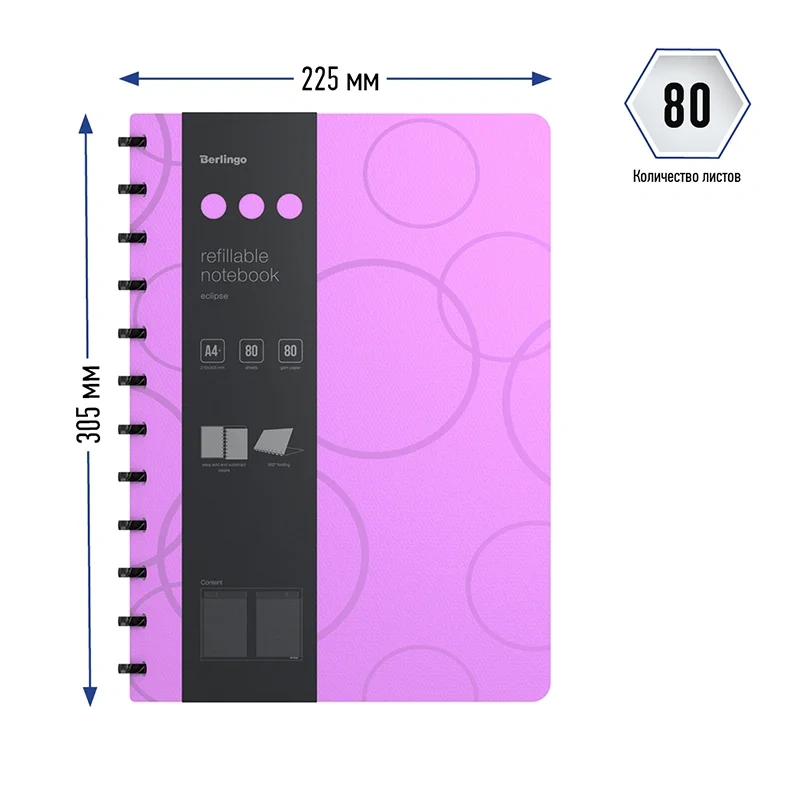 Бизнес-тетрадь Berlingo 'Eclipse' - это практичное, стильное и современное изделие для планирования и записей. Такая бизнес-тетрадь является незаменимым инструментом для деловых людей. Увеличенная толщина обложки (1500мкм). Формат А4+. Нежный фиолетовый цвет внешней стороны в сочетании с изящной фактурой в виде глянцевых пересекающихся окружностей. Контрастный яркий голубой цвет внутренней поверхности. Материал обложки - трехслойный пластик (полифом), надежно защищает внутренний блок от влаги, замятия и загрязнения, обложка устойчива к загрязнениям. Вид скрепления – стильные имиджевые черные кольца, с возможностью раскрывать тетрадь на 360?. Возможна замена бумажного блока и быстрая и удобная выемка/вставка листов без повреждений. Бизнес-тетрадь содержит съемную брендированную линейку, которую можно использовать как закладку или разделитель и с легкостью можно перемещать в удобное место. Внутренний блок – высококачественная тонированная бумага, плотностью 80г/м2, 80 листов в клетку, рамка для заголовка, темы или даты, поля с обеих сторон блока на каждом листе, линовка на вылет. Размер бизнес-тетради 305*225мм, диаметр колец 22мм. Упаковка в термоусадочную пленку позволяет предохранить листы от замятия и загрязнения в процессе транспортировки.
