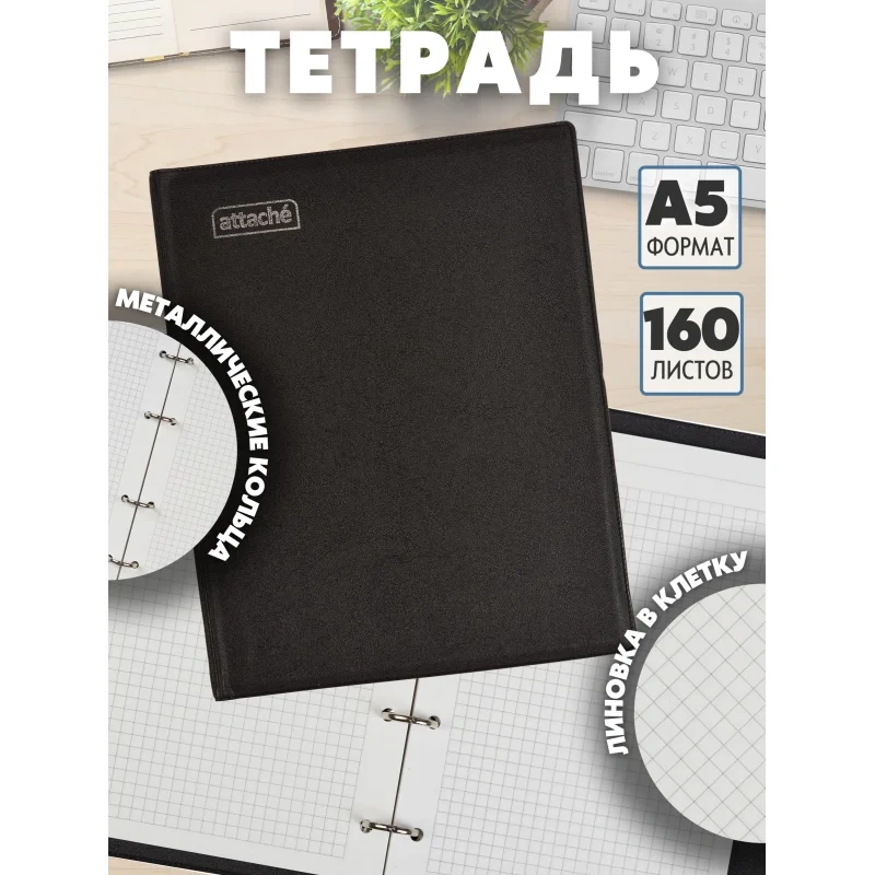 Бизнес-тетрадь А5 160л ATTACHE, на кольцах,черный, обложка ПВХ