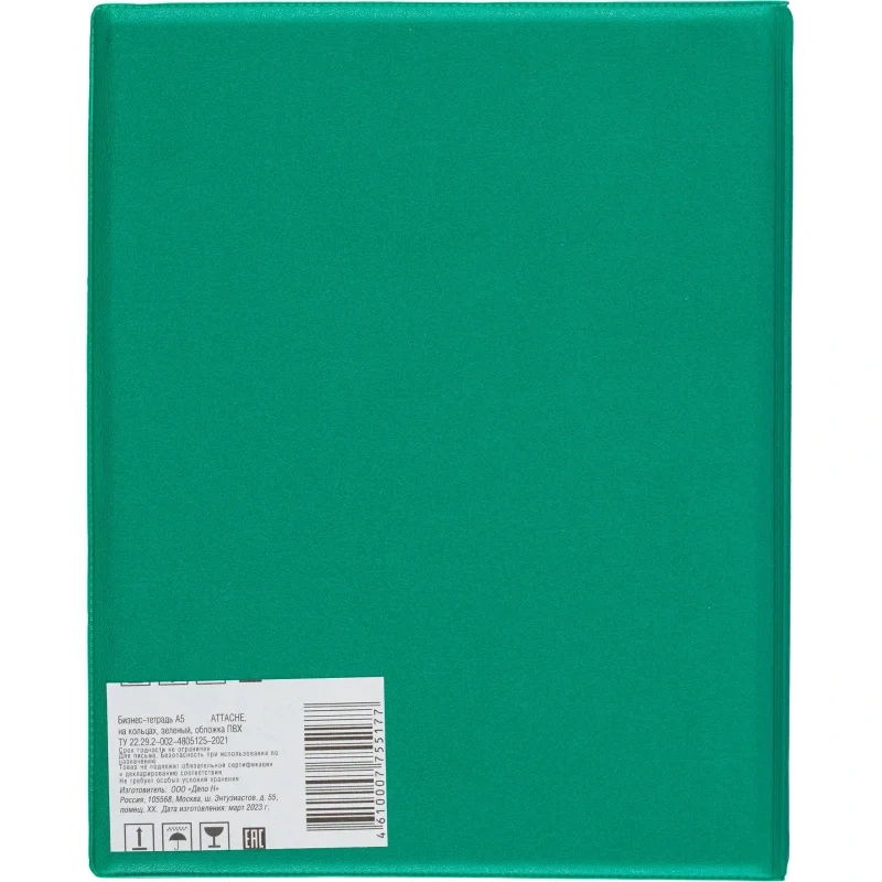 Бизнес-тетрадь на кольцах формата А5 изготовлена из переплётного картона толщиной 1.5 мм, обтянутого ПВХ плёнкой зелёного цвета с тиснением фольгой логотипа Attache. Тетрадь оснащена кольцевым механизмом на 4 кольца, что позволяет удобно добавлять и удалять страницы, а также увеличивать количество листов благодаря оптимальному диаметру колец. Перфорации нет.