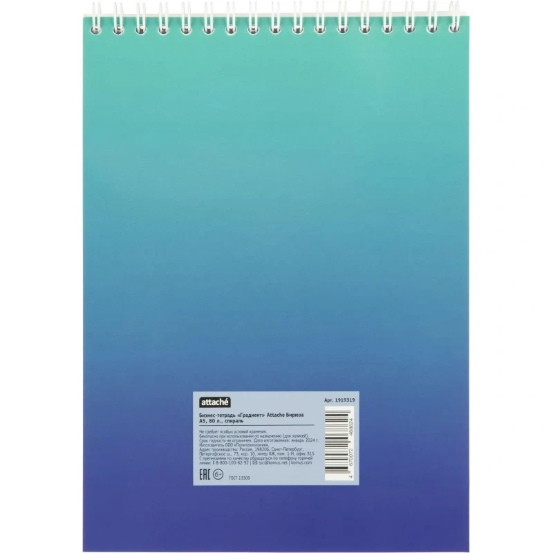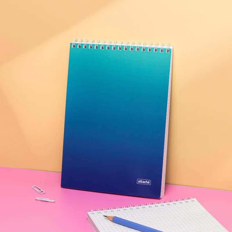 Бизнес-тетрадь Attache Градиент изготовлена форматом А5 (204×146 мм). Обложка и подложка изготовлены из мелованного картона 210 г/м2. Блок-офсетная бумага 60г/м2, разлинованная в клетку. Количество листов в блоке-80. Тетрадь скреплена металлическим гребнем (спиралью) по короткой стороне сверху. Применяется в школах, высших учебных заведениях и офисах.
