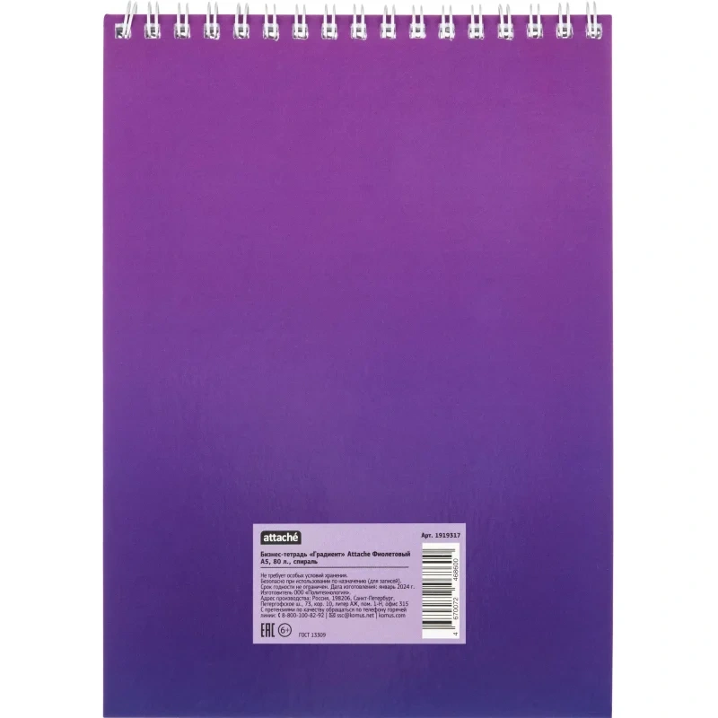 Блокнот Attache Градиент изготовлен форматом А5 (146×204 мм). Обложка и подложка-мелованный картон фиолетового цвета. Блок состоит из 80 листов в клетку, плотностью 60 г/м2. Блокнот скреплен металлическим гребнем сверху по короткой стороне. Универсальный дизайн блокнота позволяет пользоваться им в школах, высших учебных заведениях и офисах.