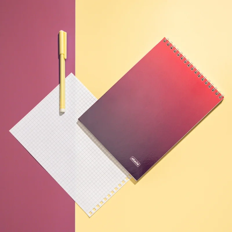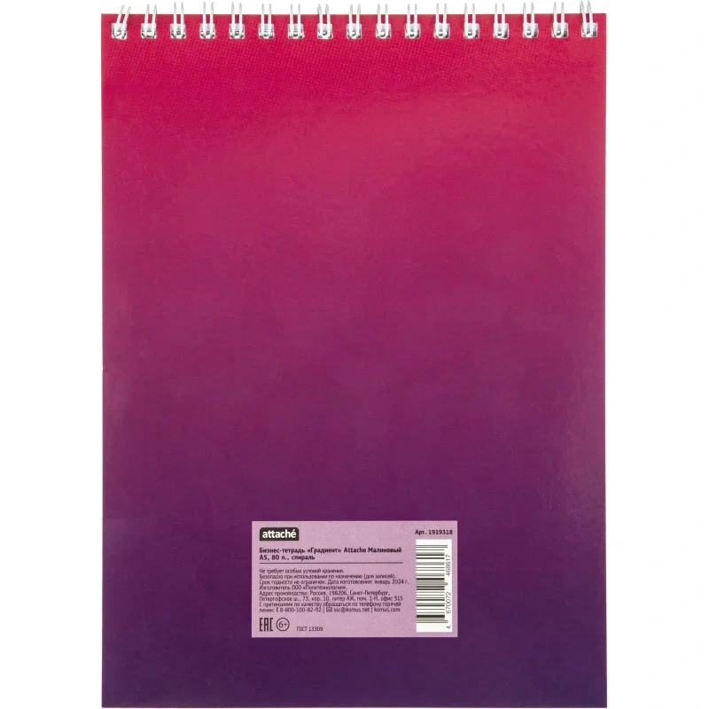 Блокнот Attache Градиент изготовлен форматом А5 (146×204 мм). Обложка и подложка-мелованный картон малинового цвета. Блок состоит из 80 листов в клетку, плотностью 60 г/м2. Блокнот скреплен металлическим гребнем сверху по короткой стороне. Универсальный дизайн блокнота позволяет пользоваться им в школах, высших учебных заведениях и офисах.
