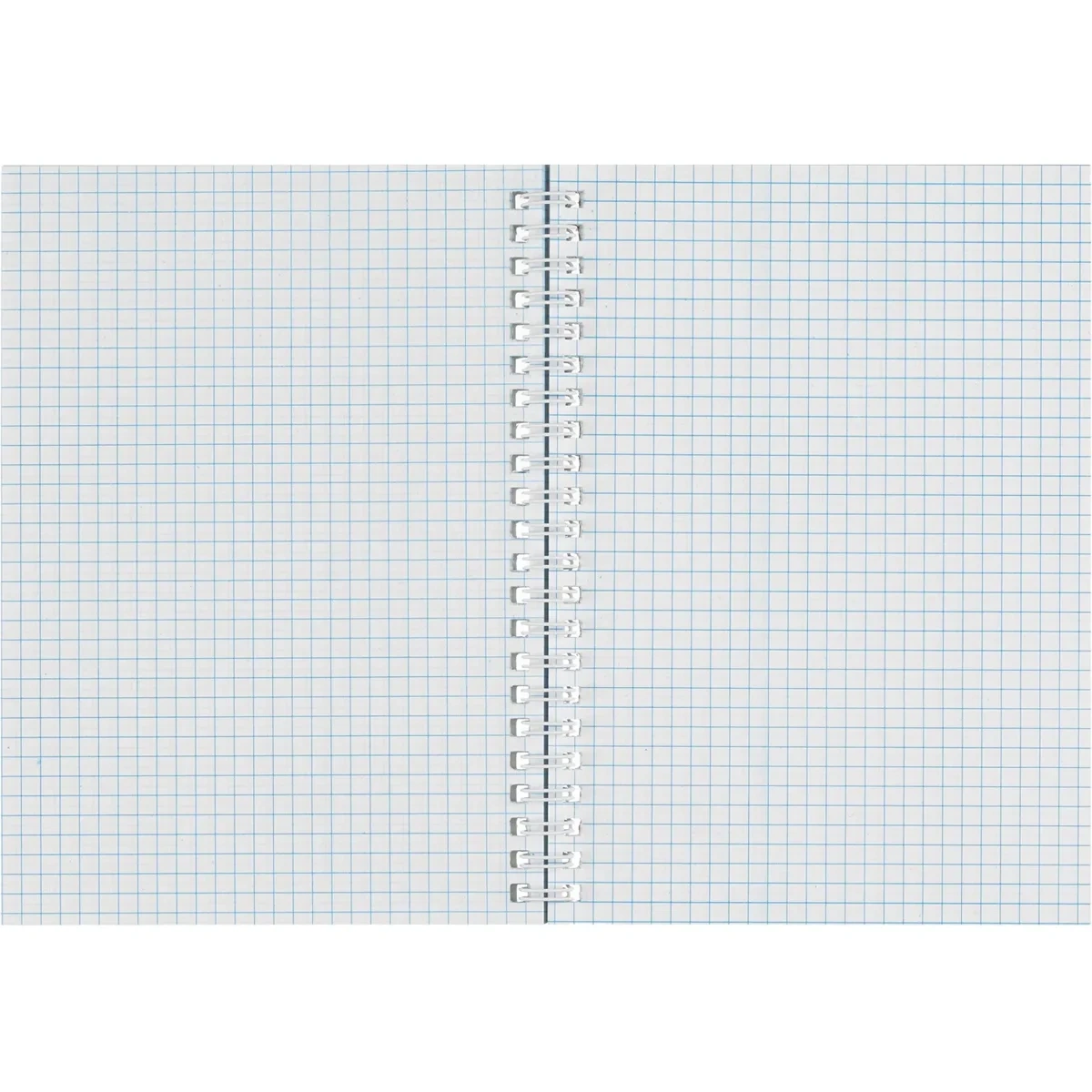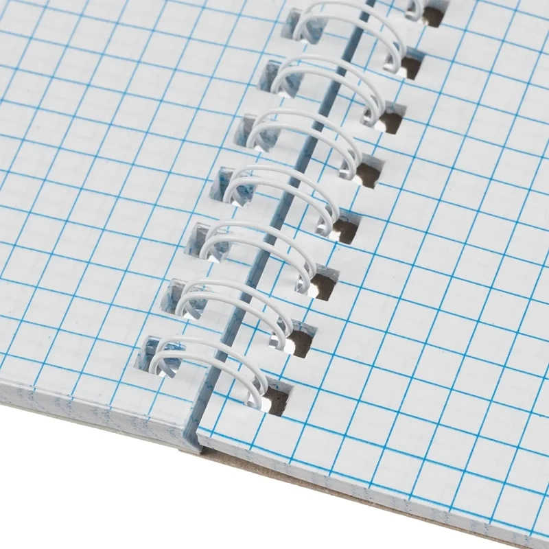 Внутренний блок содержит 80 листов офсетной бумаги плотностью 60 г/кв. м. Бумага белого цвета разлинована в клетку с синими линиями. Поля не предусмотрены. Формат А5 обеспечивает удобство письма при компактных габаритах. Крепление выполнено по левому краю с помощью спирали, что позволяет удобно перелистывать страницы и использовать тетрадь в работе. Страна происхождения — Россия.