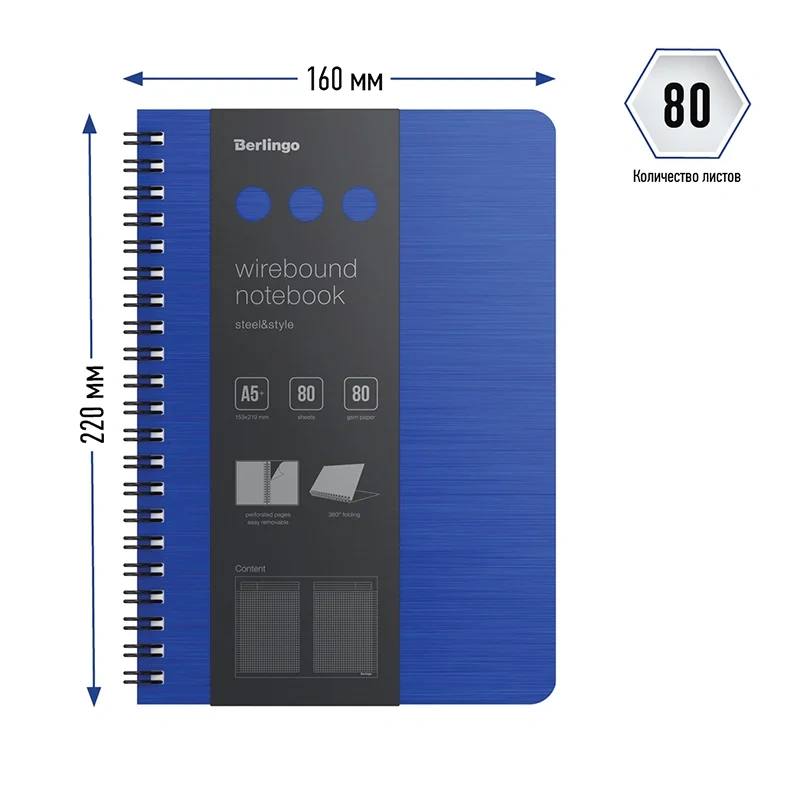 Бизнес-тетрадь Berlingo 'Steel&Style' - это практичное, стильное и современное изделие для планирования и записей. Такая бизнес-тетрадь является незаменимым инструментом для деловых людей. Увеличенная толщина обложки (1500мкм) в сочетании с фактурой 'сталь', формата А5+. Материал обложки - трехслойный пластик (полифом), надежно защищает внутренний блок от влаги, замятия и загрязнения, обложка устойчива к загрязнениям. Насыщенный синий цвет внешней стороны, в сочетании с черным цветом внутренней поверхности. Вид скрепления – гребень со стильными черными кольцами, который дает возможность раскрывать тетрадь на 360?. Бизнес-тетрадь содержит съемную брендированную линейку, которую можно использовать как закладку или разделитель и с легкостью можно перемещать в удобное место. Внутренний блок – высококачественная тонированная бумага, плотностью 80г/м2, 80 листов в клетку, рамка для заголовка, темы или даты, поля с обеих сторон блока на каждом листе, линовка на вылет. Внутренний блок имеет микроперфорацию для ровного отрыва листа и дальнейшего хранения или подшивки в аккуратном виде. Размер бизнес-тетради 220*160мм, диаметр гребня 21мм. Упаковка в термоусадочную пленку позволяет предохранить листы от замятия и загрязнения в процессе транспортировки.