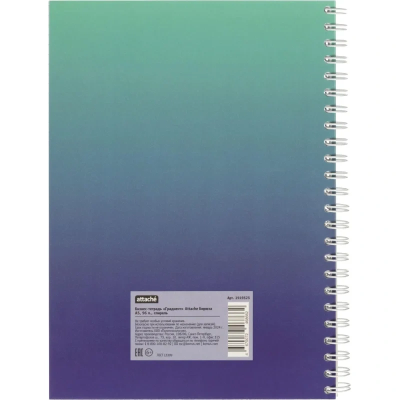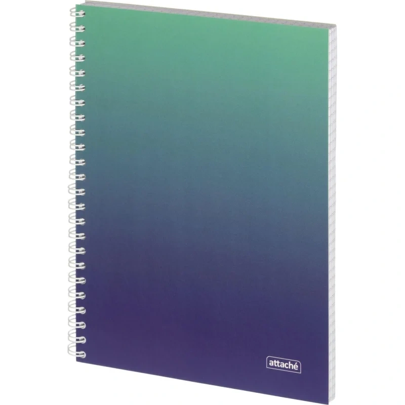 Бизнес-тетрадь Attache Градиент изготовлена форматом А5 (146×204 мм). Обложка и подложка изготовлены из мелованного картона 190-210 г/м2. Блок-офсетная бумага 60г/м2, разлинованная в клетку. Количество листов в блоке-96. Бизнес-тетрадь скреплена металлическим гребнем (спиралью) по длинной стороне слева. Применяется в школах, высших учебных заведениях и офисах.