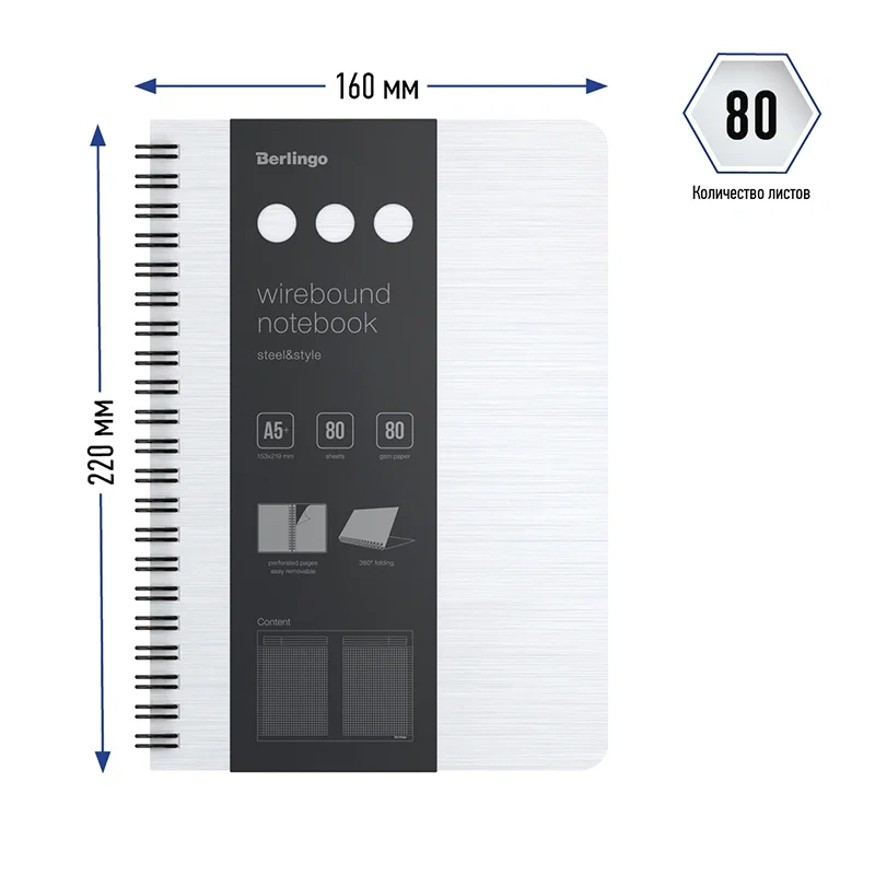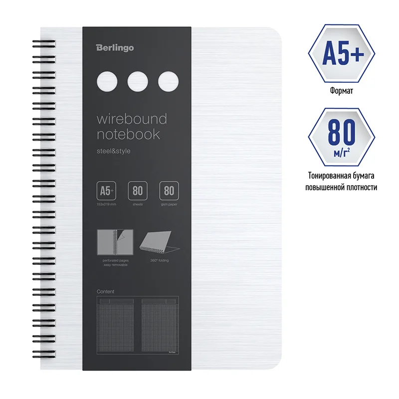 Тетрадь скреплена металлическим гребнем, представляющим собой евроспираль, при которой двойной металлический гребень обжимает корешок, обеспечивая надежную фиксацию листов и удобство перелистывания. Крепление расположено слева по длинной стороне.Производство и комплектация