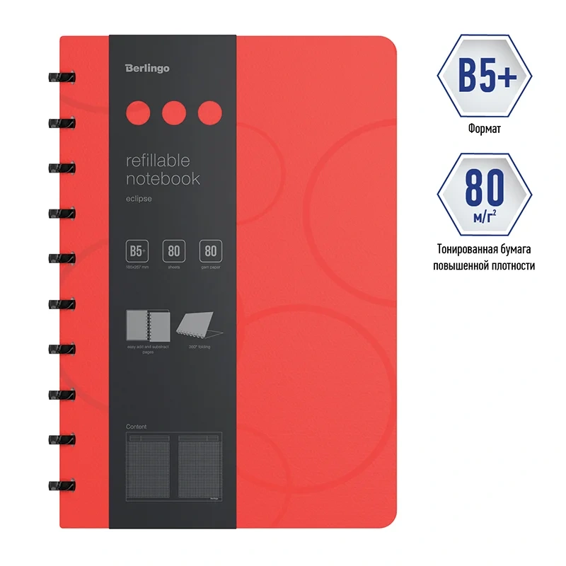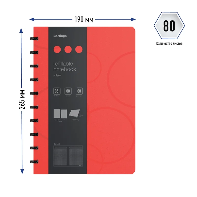 Обложка изготовлена из картона фиолетового цвета, имеет мягкую конструкцию и обработана ВД-лаком. Плотность обложки составляет 210 г/кв. м. Внутренний блок скреплён слева металлической спиралью типа гребень, которая обжимает корешок, обеспечивает надёжную фиксацию листов и удобство перелистывания. Изделие произведено в России и поставляется по одной штуке.