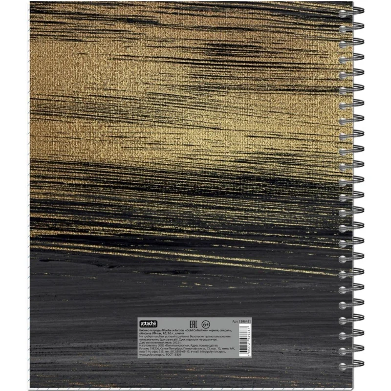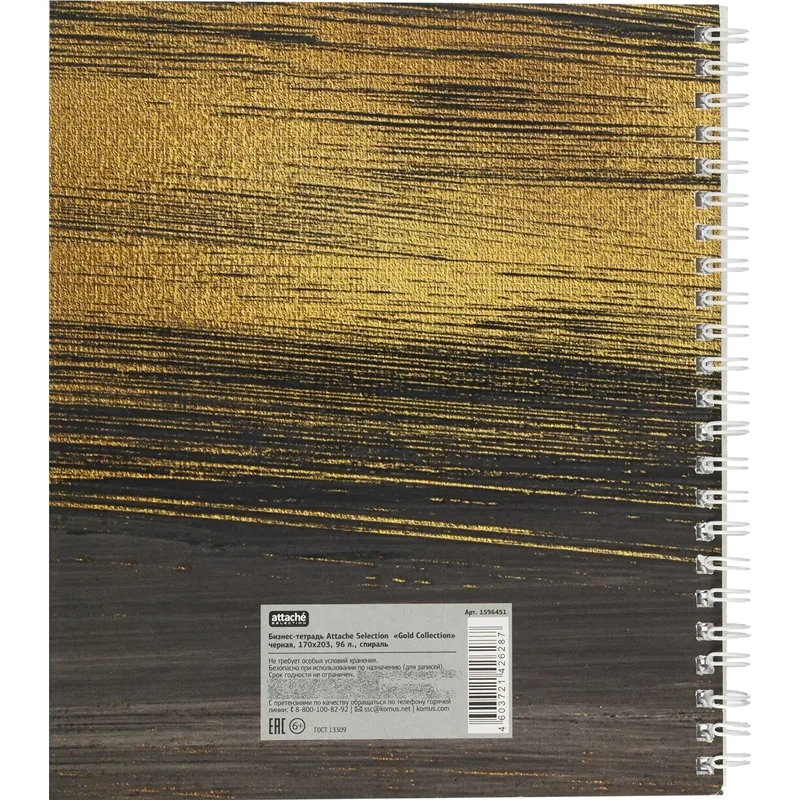 Бизнес-тетрадь Gold Collection представлена в формате А5. Размер изделия: 170×203 мм. Обложка сделана из мелованного картона. Плотность обложки и подложки: 200 г/кв.м. Бумажный блок содержит 96 листов белой, офсетной бумаги в клетку. Плотность блока — 60 г/кв.м. Тип крепления — спираль.