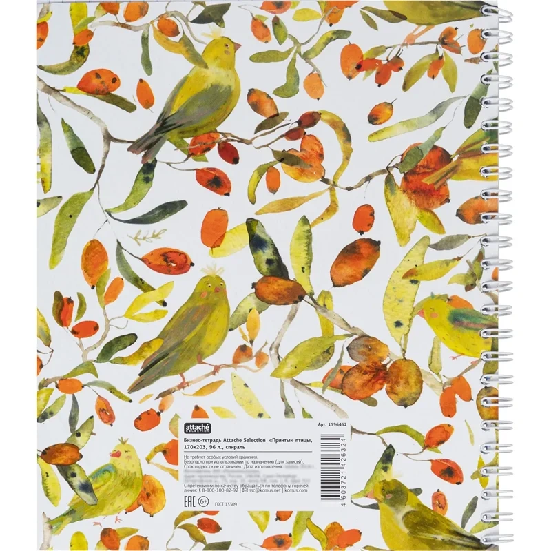 Бизнес-тетрадь Принты Птицы представлена в формате А5. Размер изделия: 170×203 мм. Обложка сделана из мелованного картона. Плотность обложки и подложки: 200 г/кв.м. Бумажный блок содержит 96 листов белой, офсетной бумаги в клетку. Плотность блока — 60 г/кв.м. Тип крепления — спираль.