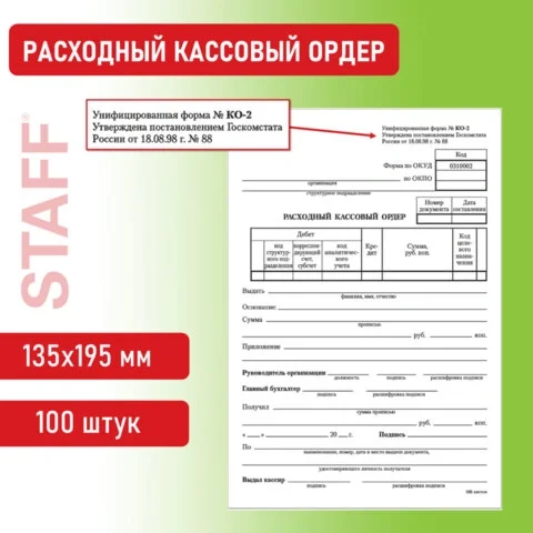 Бумага офсетная плотностью 60 г/м2. Внутренний блок проклеен по одному краю. Бланк выполнен по унифицированной форме № КО-2. Формат А5 (135х195 мм). Поставляется в виде книжки в количестве 100 штук в термоусадочной пленке. Соответствует государственным стандартам документального ведения учета.
