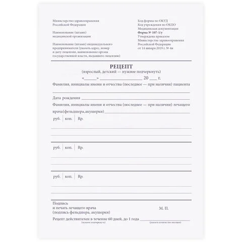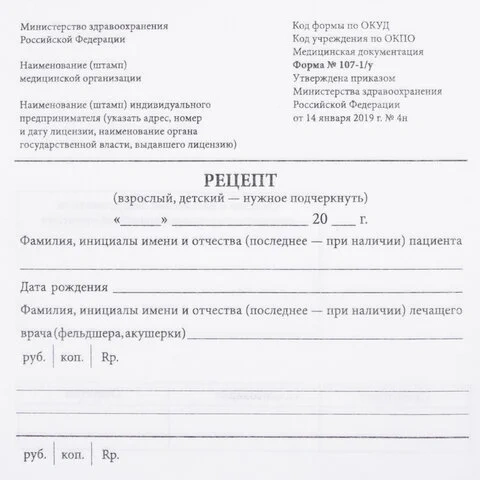 Бланк медицинский рецептурный, форма 107-1/у, А5, 135х195 мм, СКЛЕЙКА, 100 штук, офсет, STAFF, 13027