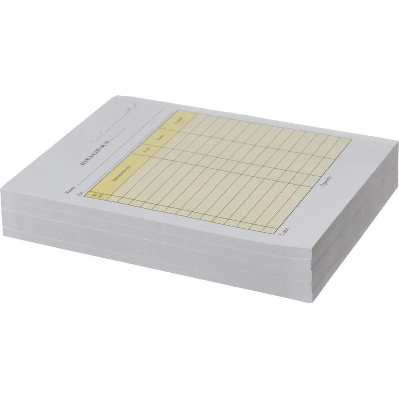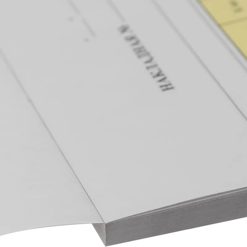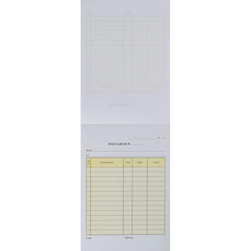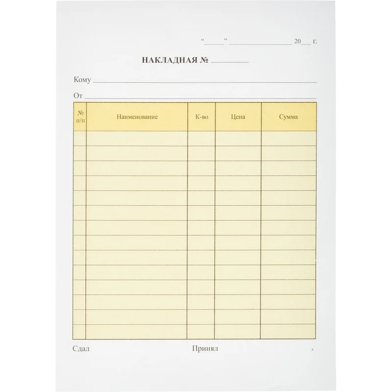 Самокопирующие бланки Накладная изготовлены из двухслойной самокопирующейся бумаги формата А5. Изделие представляет собой склеенные по краю листы, которые можно легко отделить друг от друга. Каждый бланк состоит из двух листов, различающихся по цвету. Печать краски — 4+0. Перфорации нет. Изделие предназначено для получения нескольких копий заполненных документов. Упаковка самокопирующихся бланков Накладная содержит 50 экземпляров. По бланкам рекомендуется писать шариковыми ручками с обычными чернилами — не с масляными и не с гелевыми, с усилением, на ровной твердой поверхности.