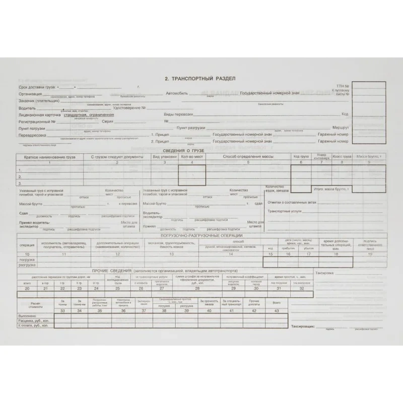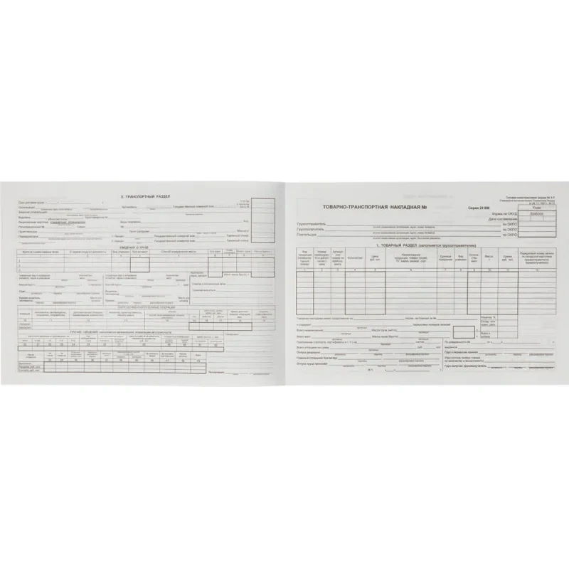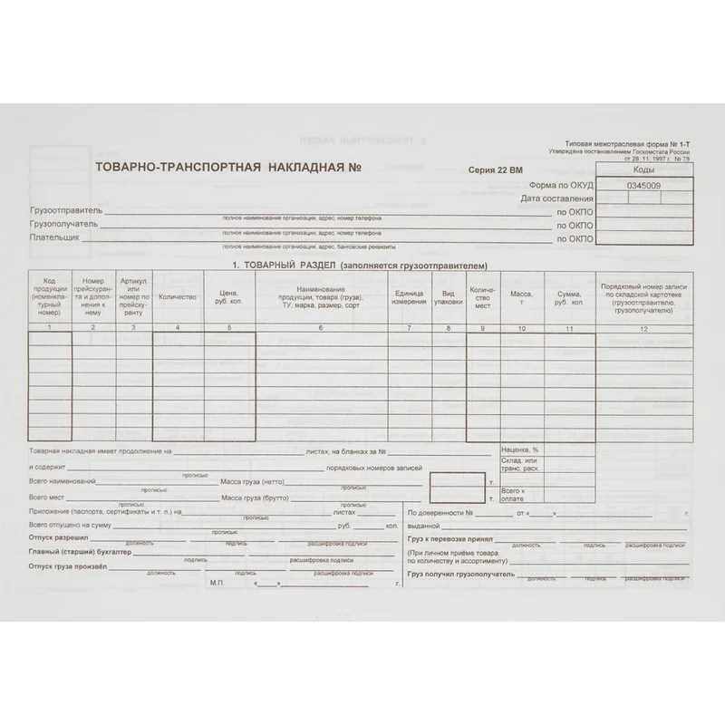 Бухгалтерские бланки — товарно-транспортная накладная, типовая межотраслевая форма 1-Т. Применяются для учета движения товарно-материальных ценностей при перевозке автомобильным транспортом. Бланки отпечатаны на офсетной бумаге формата А4. В комплекте 100 штук, склеенных в виде книжки. Упакованы в термоусадочную пленку.