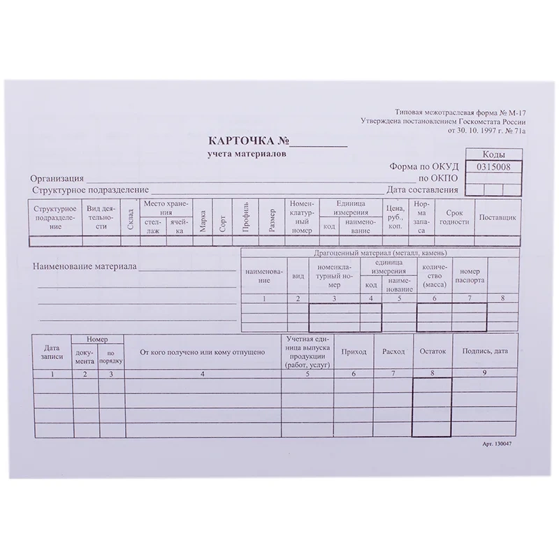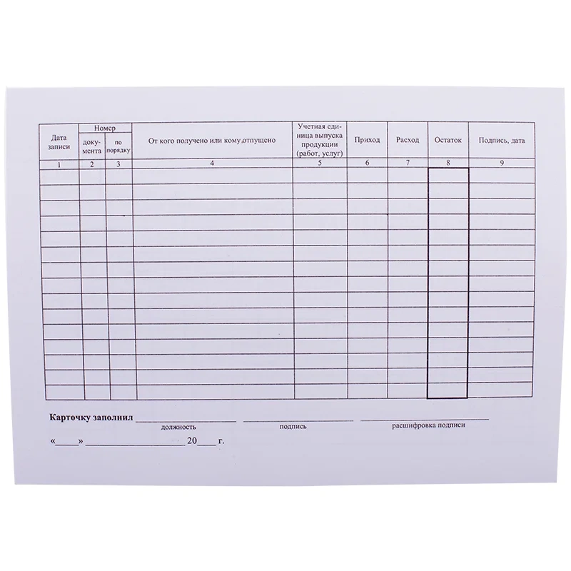 | Вид товара | карточка складского учета материалов |