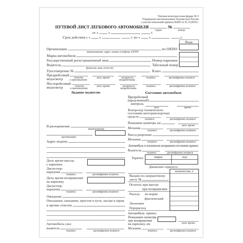 Бланк Officespace Путевой лист легкового автомобиля, А5, от 18.01.2017, 100шт/уп