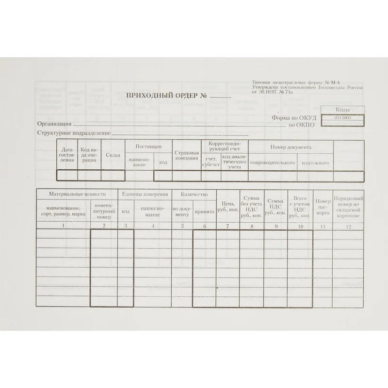 Бланк приходный ордер М-4 А4, 150х210 мм, 100шт, пустографка