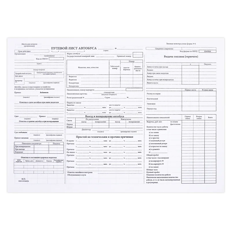Бланк Путевой лист автобуса (форма №6), А4, офсет, 100 экз., в пленке т/у
