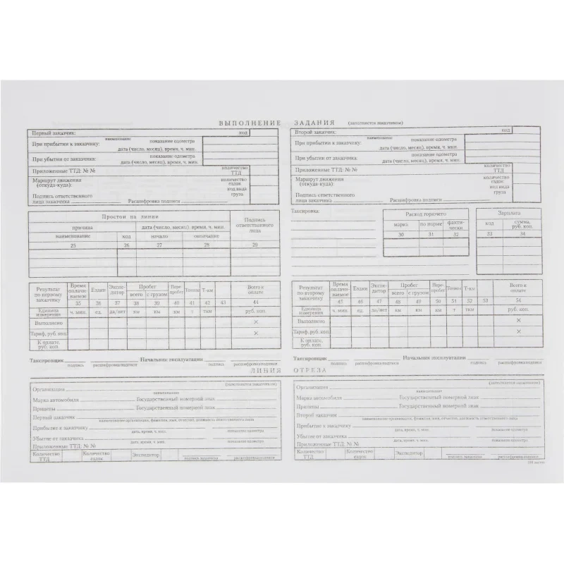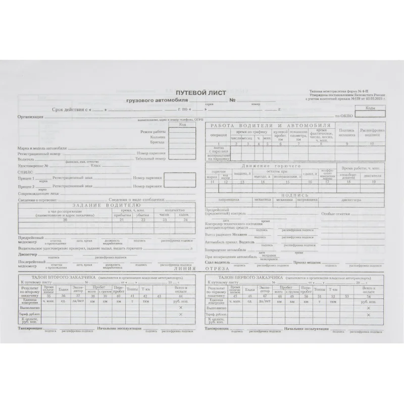 Бухгалтерские бланки — путевой лист грузового автомобиля, обновленная типовая форма 4-П (от 05.05.2023 г.). Применяются при повременной оплате грузоперевозок. Бланки отпечатаны на офсетной бумаге формата А4. В комплекте 100 штук, клеенных в виде книжки. Упакованы в термоусадочную пленку. Отсчет и запаковка бланков осуществляются на автоматическом оборудовании. В связи с этим, согласно имеющимся допускам оборудования, погрешность в количестве бланков в упаковке может составлять +/-3%.