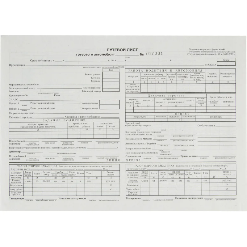 Бухгалтерские бланки — номерной путевой лист грузового автомобиля, типовая форма 4-П. Применяются при повременной оплате грузоперевозок. Бланки отпечатаны на газетной бумаге формата А4. В комплекте 100 штук, склеенных в виде книжки. Упакованы в термоусадочную пленку. Плотность 45 г/кв.м.