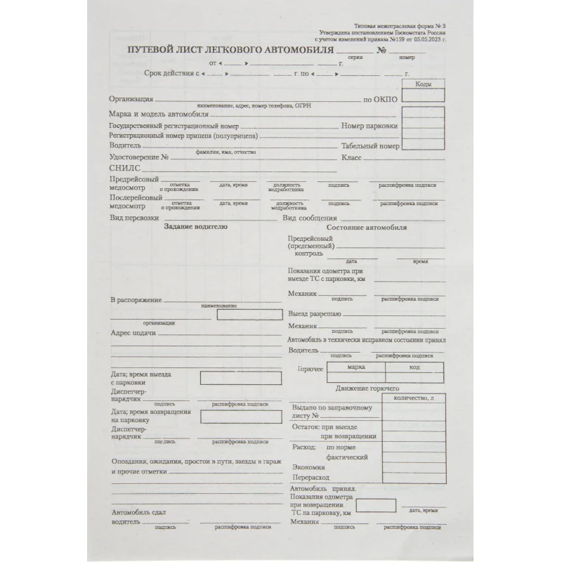 Бухгалтерские бланки — путевой лист легкового автомобиля, типовая межотраслевая форма № 3. Применяются в процессе организации перевозок грузов и пассажиров. Бланки отпечатаны на газетной бумаге формата А5 плотностью 45 г/кв.м. Размер: 135×195 мм. В упаковке 20 блоков (книжек) по 100 листов.