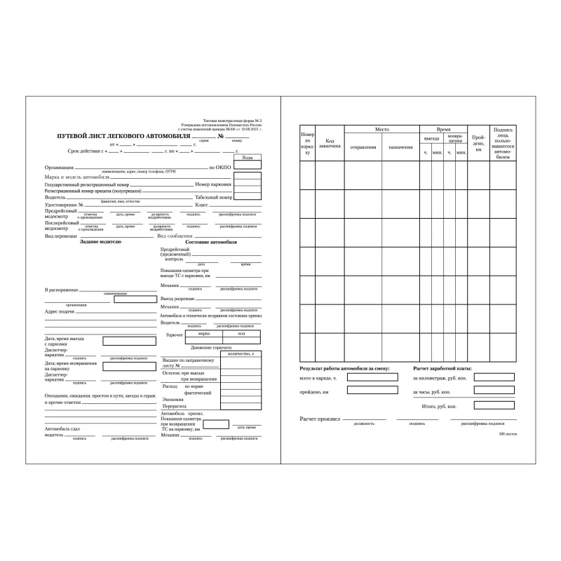 Бланк путевой лист легкового автомобиля А5, 150х210 мм, 100шт, пустографка