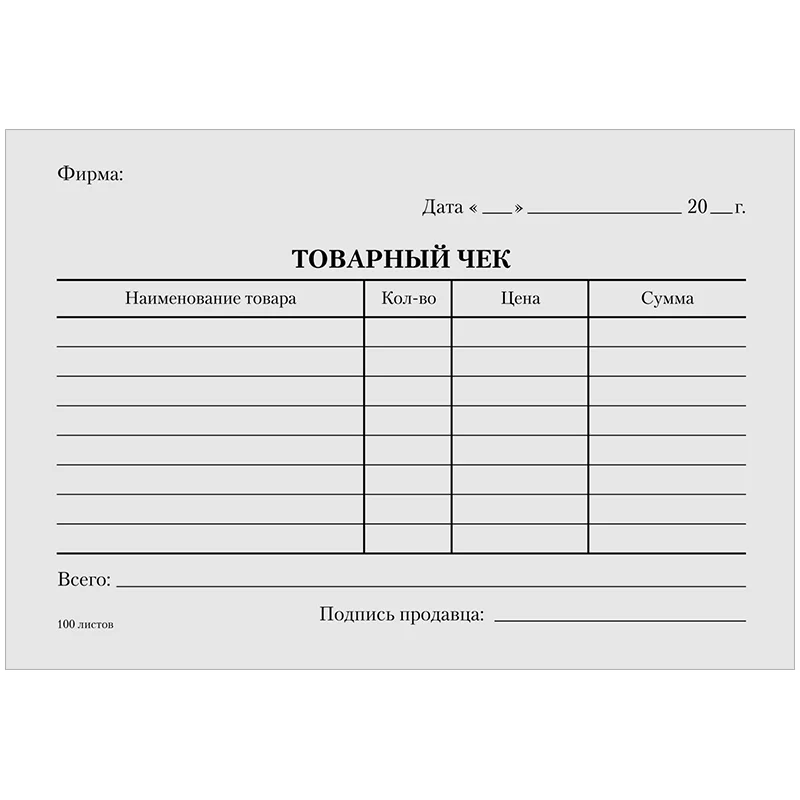 Бланк 'Товарный чек'. Бланки изготовлены из газетной бумаги и склеены в книгу по 100 листов. Индивидуальная упаковка в термоусадочную пленку.