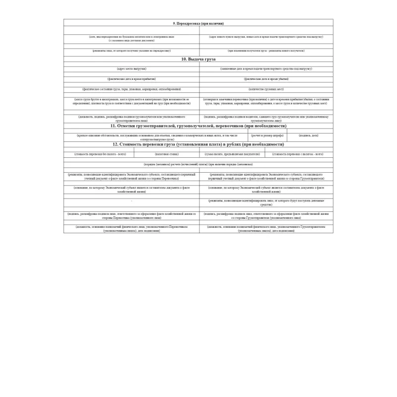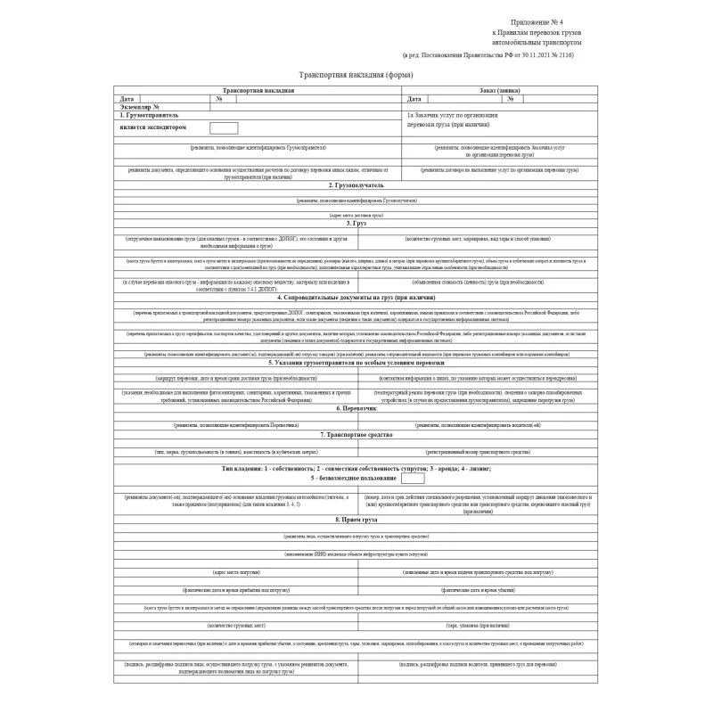 Бухгалтерские бланки — транспортная накладная. Действуют наряду с товарно-транспортной накладной формы 1-Т, применяются для учета движения товарно-материальных ценностей при перевозке автомобильным транспортом. Бланки отпечатаны на офсетной бумаге формата А4. Форма соответствует Постановлению Правительства РФ от 31.12.2021 № 2116, которая действительна с 01 января 2021 г. В комплекте 100 штук, склеенных в виде книжки. Упакованы в термоусадочную пленку.