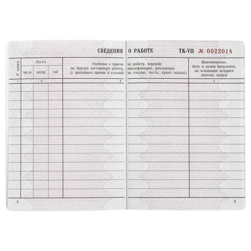 Форма бланка утверждена Приказом Минтруда России от 19.05.2021 №320н, вводится в действие с 1 января 2023 г. Защитный комплекс трудовой книжки включает в себя двухтоновой водяной знак, защитные волокна, бумага имеет две химические защиты – от вытравливания и для идентификации подлинности. На листы книжки нанесена гильоширная сетка, невидимая уф-краска, имеется ирисный переход и микротекст. Документ сшит защищенными нитками специальным швом, что исключает возможность замены листов. Бланк имеет 14 разворотов в разделе со сведениями о работе и 7 разворотов в разделе награждения.