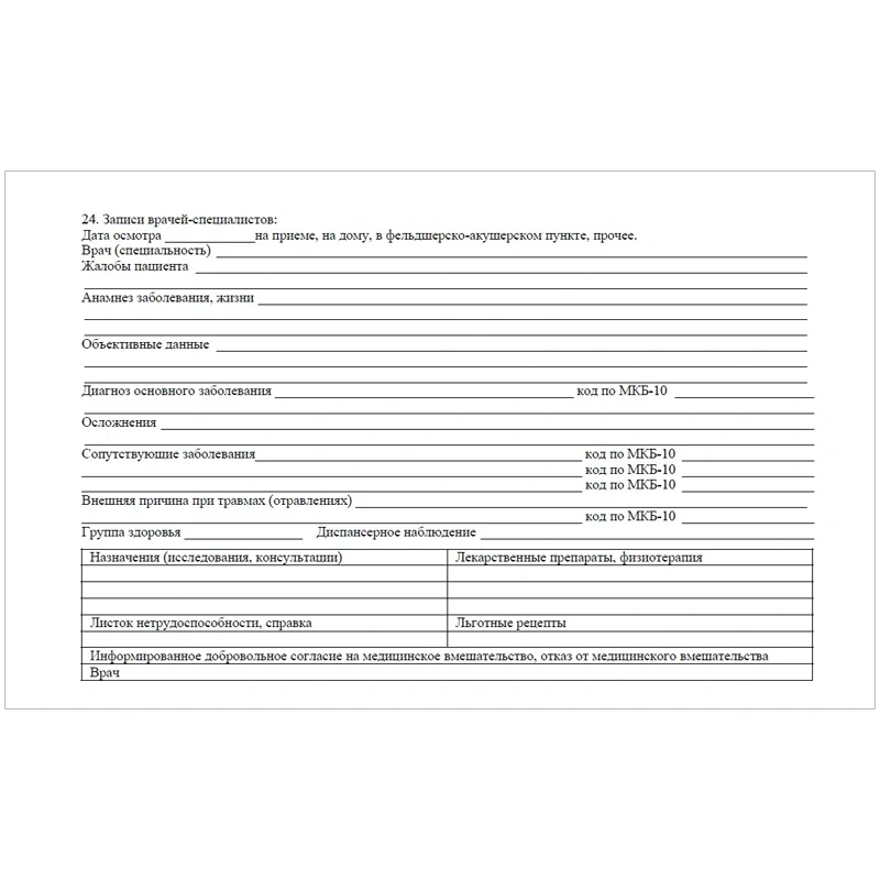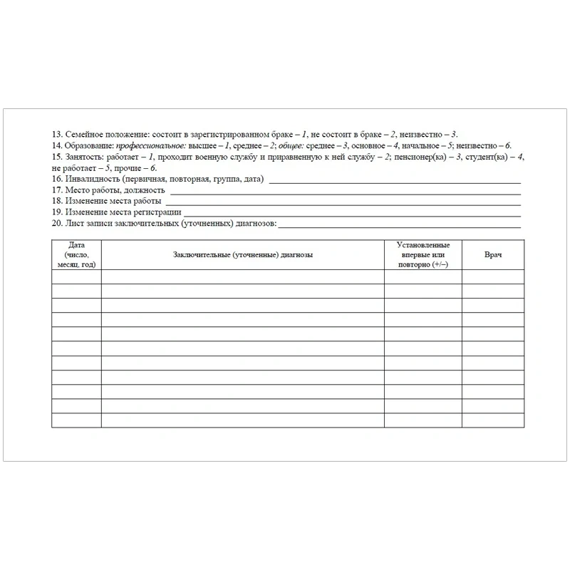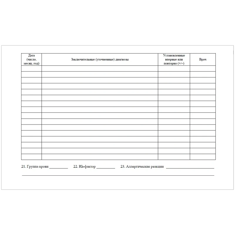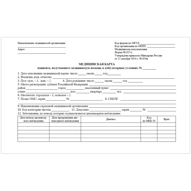 Медицинская карта пациента, получающего медицинскую помощь в амбулаторных условиях, форма №025/у-04 (утверждена Приказом Минздрава России от 15 декабря 2014 года №834н). Формат А5, блок- 100 листов, газетка 45 г/м2, обложка- мелованнй картон, припрессовка матовой пленкой, 200 г/м2. Скрепление - склейка.