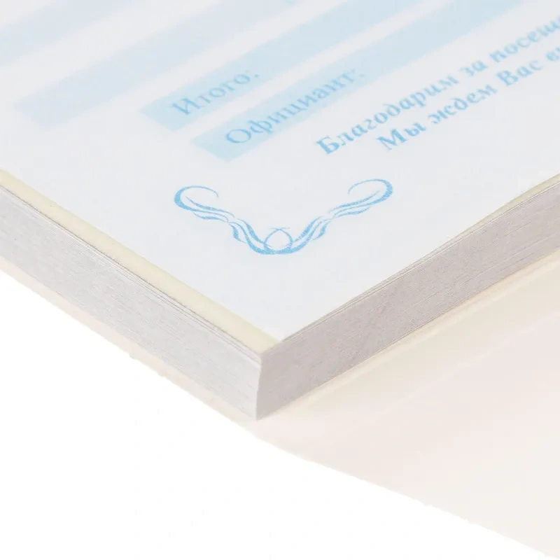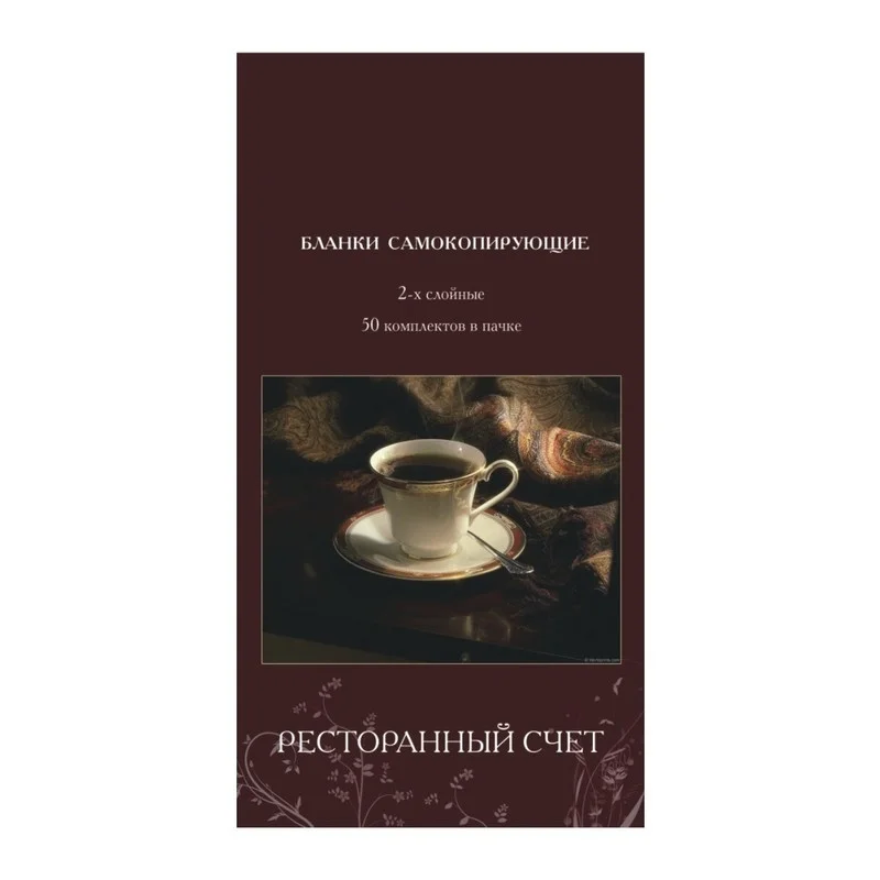Самокопирующие бланки Ресторанный счет изготовлены в виде книжки, которая имеет обложку из мелованного глянцевого картона (плотность 200 г). Перфорации нет. Поверхность изделия декорирована рисунком. Изготовлены из двухслойной самокопирующейся бумаги. Каждый бланк состоит из белых и тонированных листов. Книжка самокопирующихся бланков содержит 50 экземпляров. Чтобы избежать копирования на последующие слои, необходимо положить отворот обложки под заполняемый бланк. По бланкам рекомендуется писать шариковыми ручками с обычными чернилами — не с масляными и не с гелевыми, с усилением, на ровной твердой поверхности.